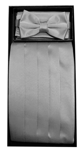 Add a special touch to your tuxedo or uniform with this 3-piece silver cummerbund, pre-tied bow tie, and handkerchief set. This silverĀ cummerbund will accentuate your tuxedo and is great for any formal event.