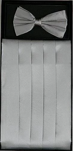 Add a special touch to your tuxedo or uniform with this silver cummerbund and pre-tied bow tie set. This silver cummerbund will accentuate your tuxedo and is great for any formal event.