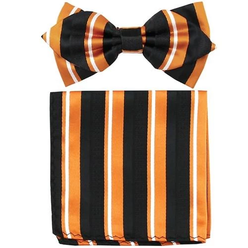 Add a modern touch in your wardrobe with this orange striped bow tie and matching pocket square. Made out of polyester, this pointed tip woven bow tie features bold orange, black, and white stripes. This bow tie and pocket square set comes packaged in a nice box, so it makes a great gift for men!