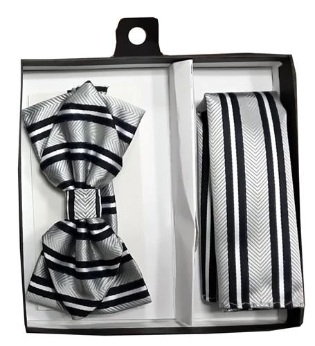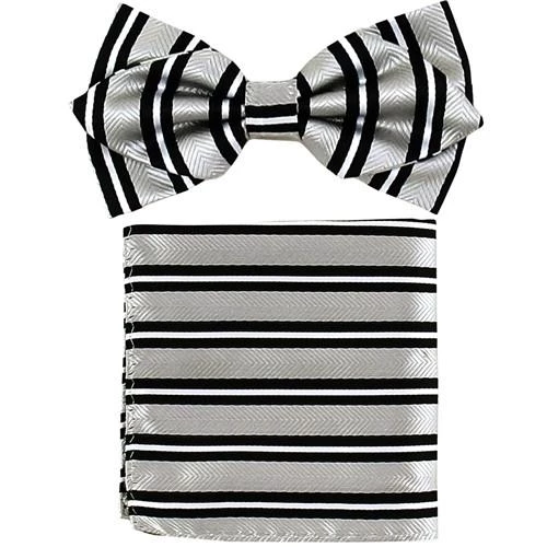 Easily accentuate your style with this silver and black striped bow tie and matching pocket square. Made out of polyester, this pointed tip woven bow tie features classic black stripes with herringbone pattern. This bow tie and pocket square set comes packaged in a nice box, so it makes a great gift for men!