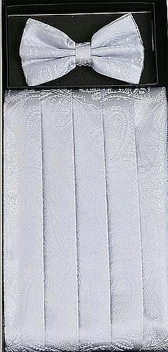 Add a timeless touch to your tuxedo or uniform with this silver paisley cummerbund and pre-tied bow tie set. This silver paisley cummerbund will accentuate your tuxedo and is great for any formal event.