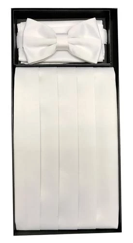 - 3-piece set includes: cummerbund, pre-tied bow tie, and hanky