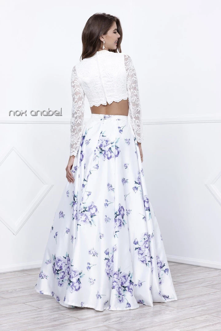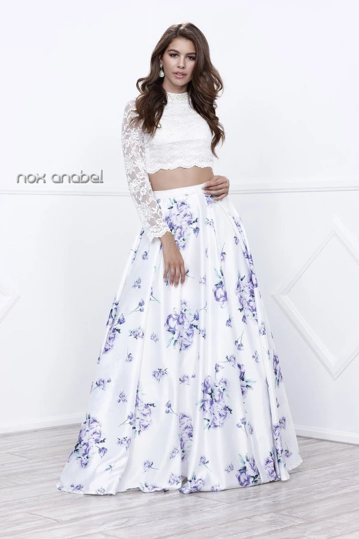 Look amazing in this white lace two-piece crop top purple floral print dress by Nox Anabel Style Number 8207 at your upcoming formal event. This long evening gown features a long sleeved lace crop-top, the long skirt is decorated with a love purple floral print, and a zipper closure.