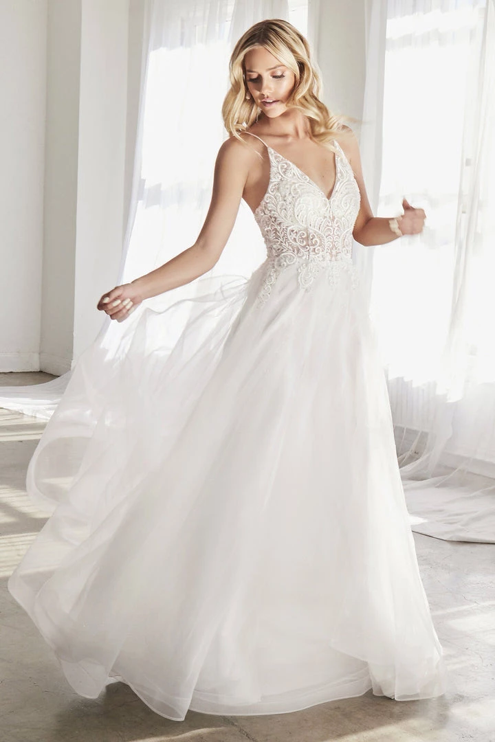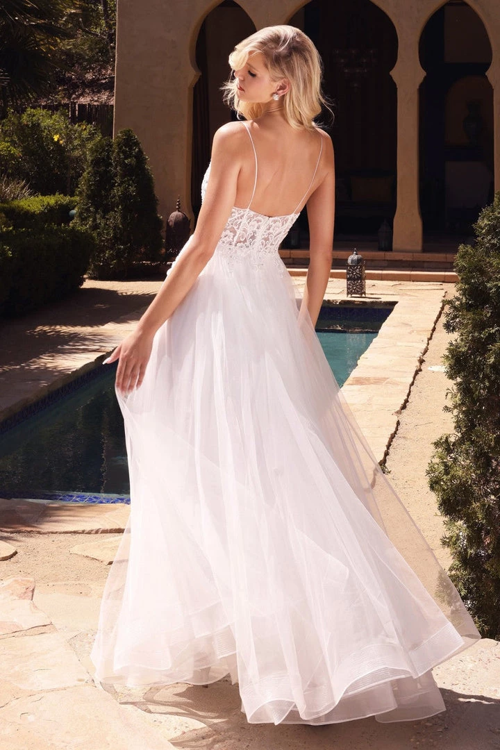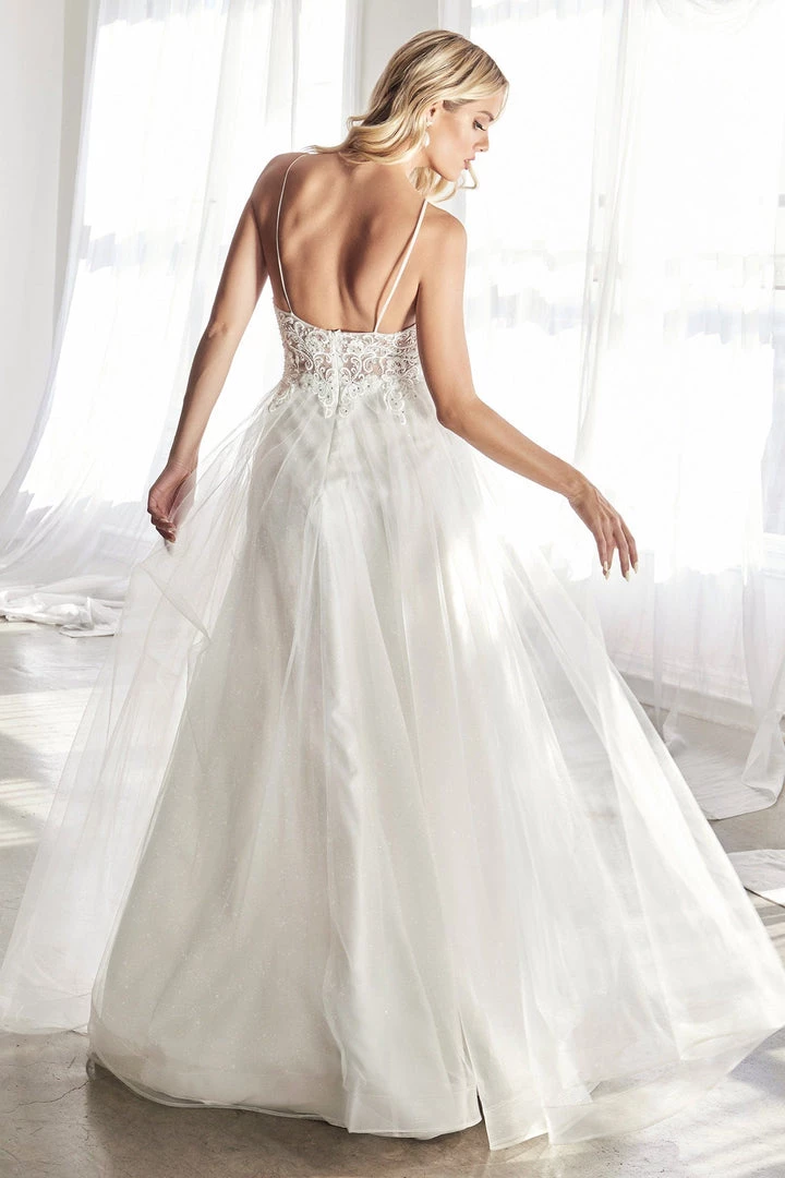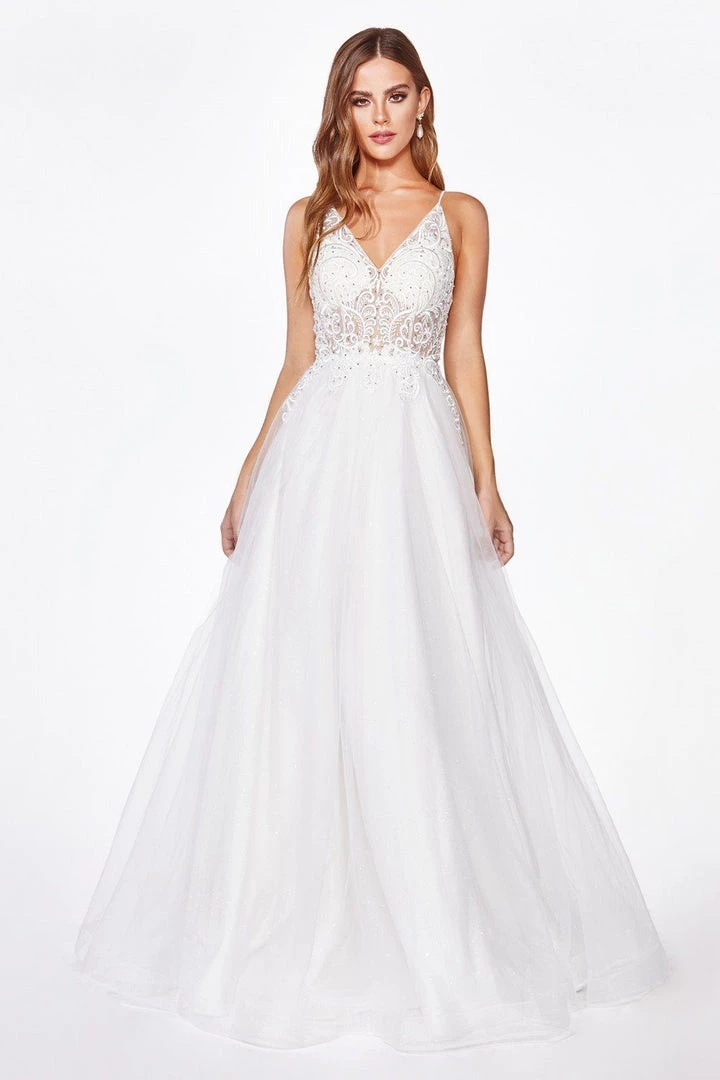 Sparkle under the stars in this off white long A-line glitter tulle dress with lace V-neck bodice by Cinderella Divine KC897W.