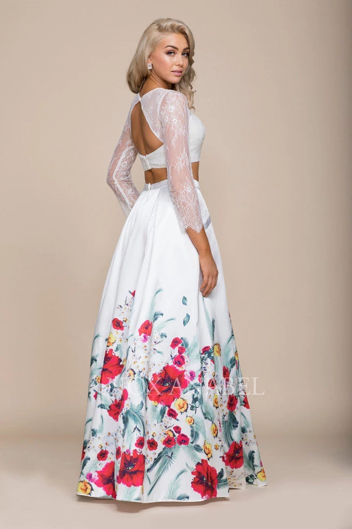 Rock this white two-piece crop top red floral print dress by Nox Anabel 8353 at your upcoming formal event. This evening gown features a white lace crop-top with sheer long sleeves, the long A-line skirt is decorated with a vibrant red and yellow floral print, keyhole open back, versatile side pockets, and a zipper closure. Affordably priced under $200, this dress is perfect for any formal event and will keep you on budget!