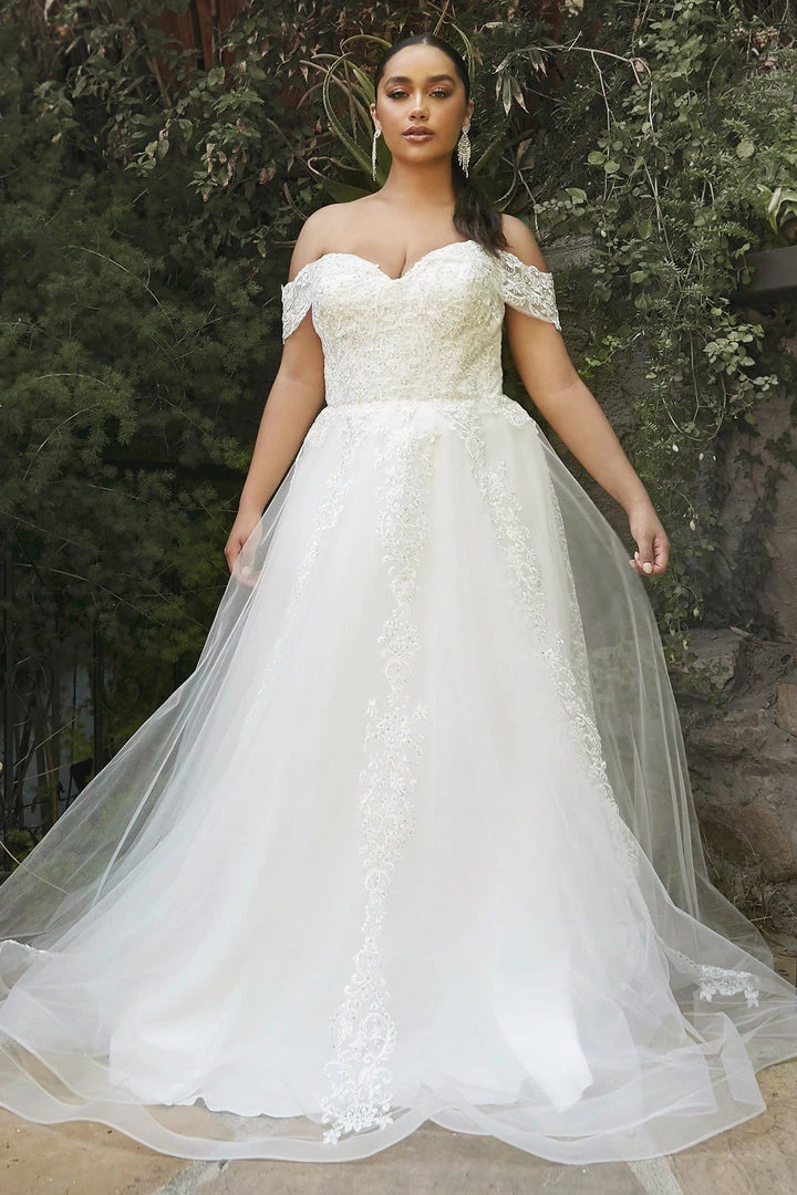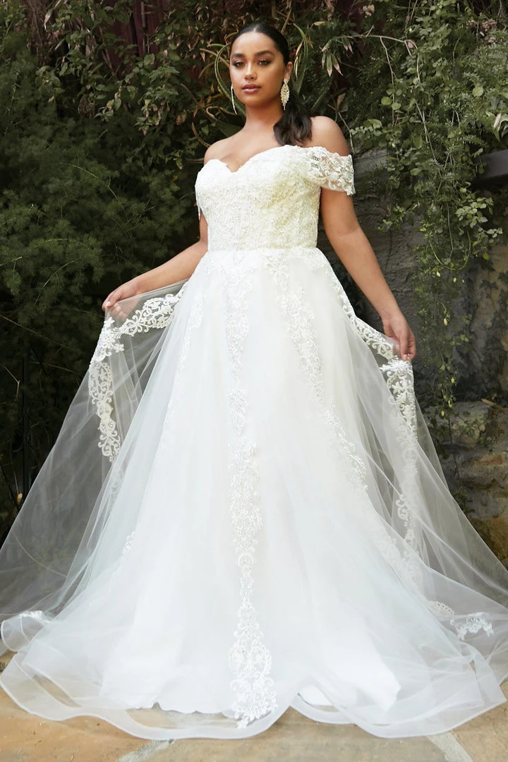 - White Off Shoulder Tulle Gown with Beaded Lace