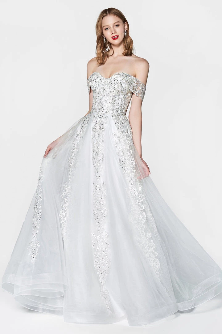 You’ll love twirling around in this white long off the shoulder A-line dress with corset back by Cinderella Divine KC19070W. We love this beautiful off the shoulder embellished lace A-line tulle gown with lace up back.
