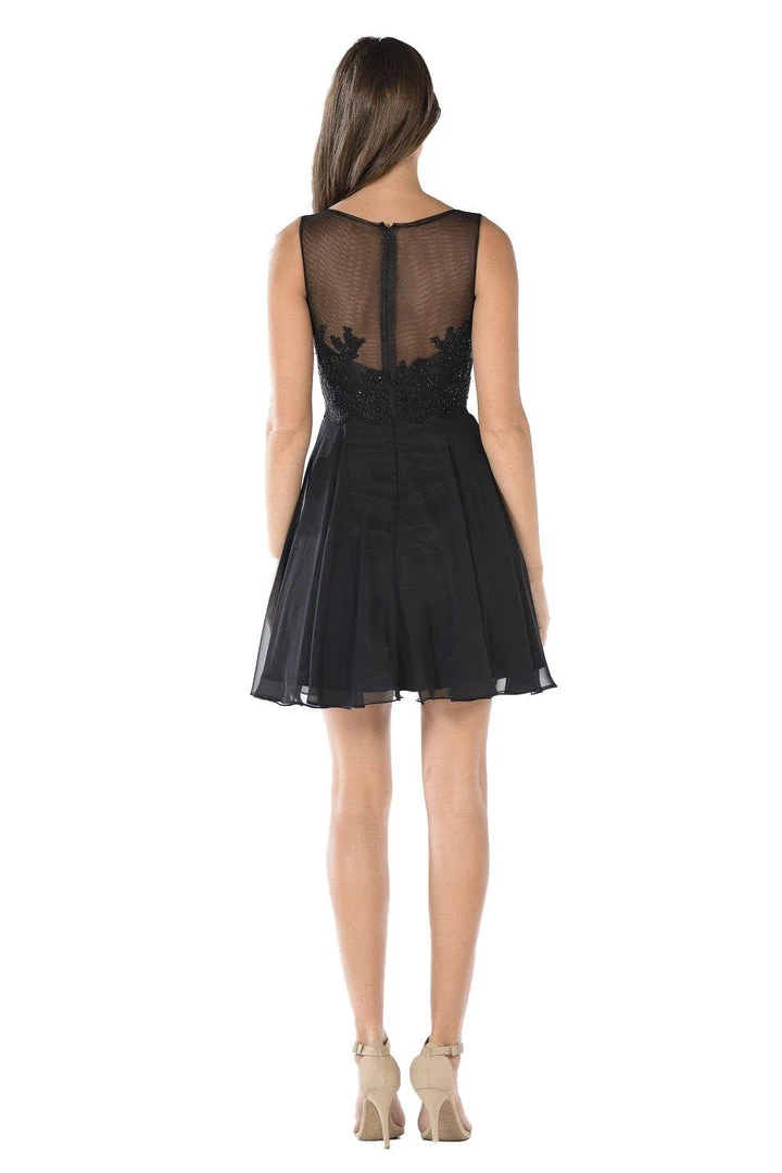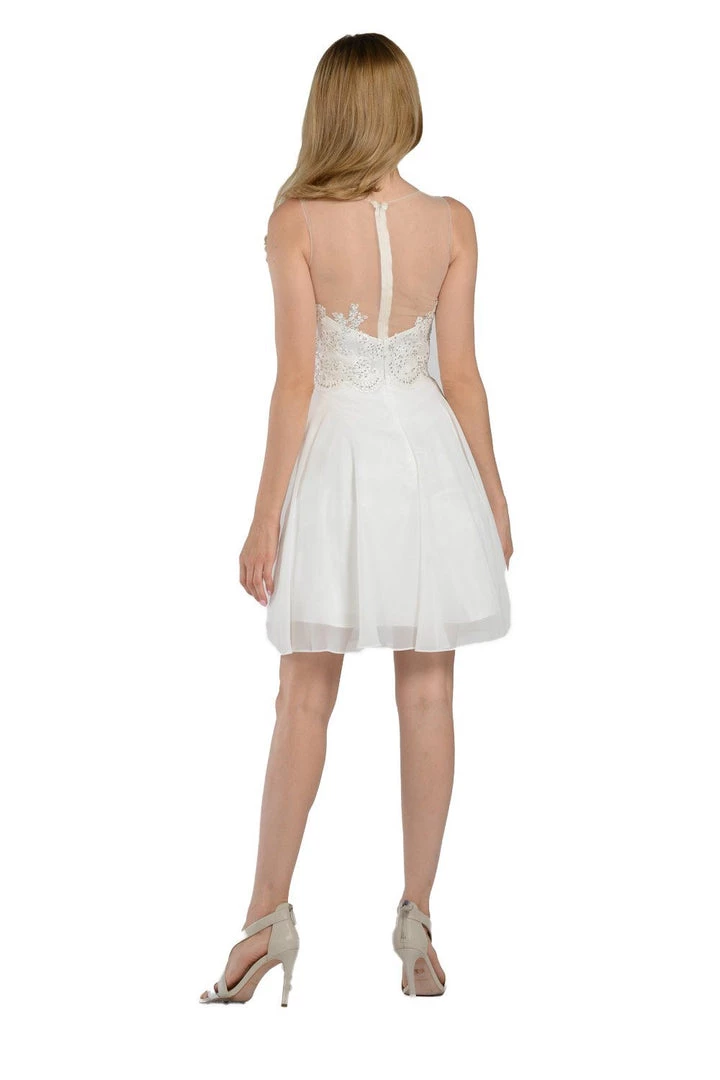 Look effortlessly elegant in this short off-white chiffon dress with beaded lace applique bodice by Poly USA 7652. This cocktail dress features a sleeveless bateau bodice embellished with intricate beaded lace appliques. A sheer back, a short knee-length A-line skirt, and a zipper closure complete this beautiful look. Affordably priced at $150, this dress is perfect for any formal event and will keep you on budget!